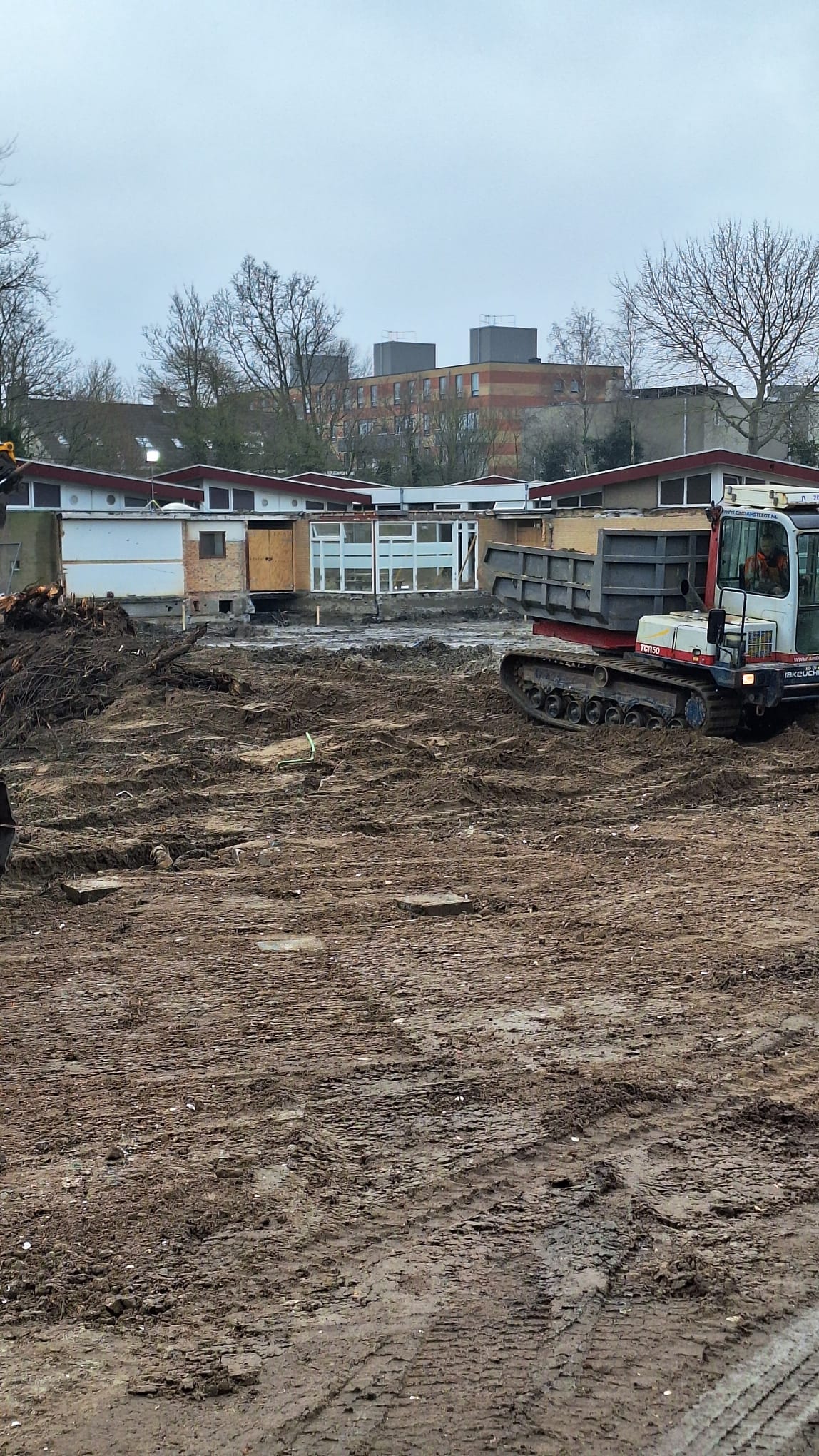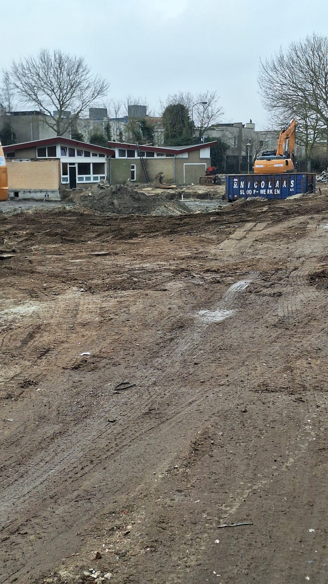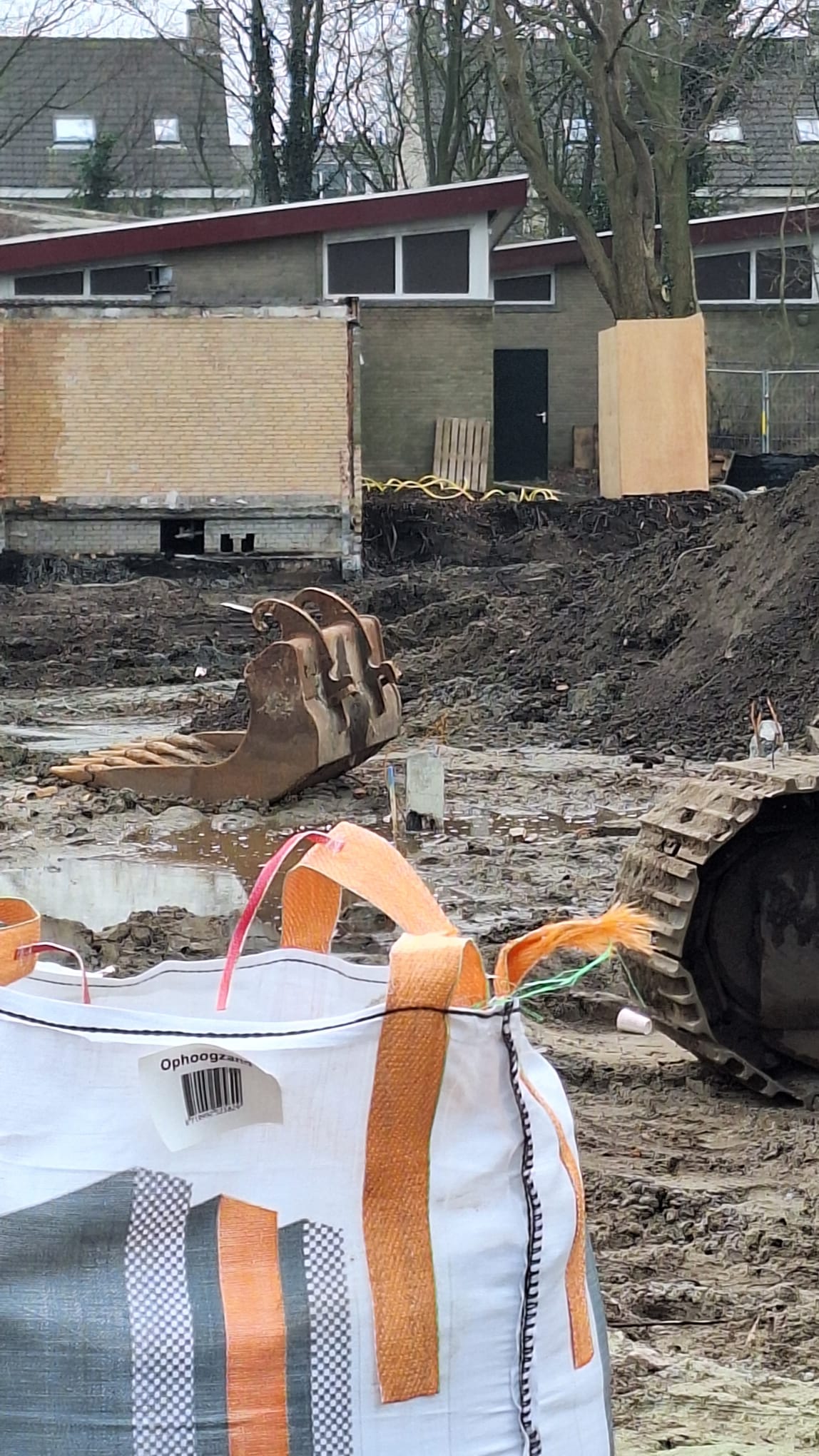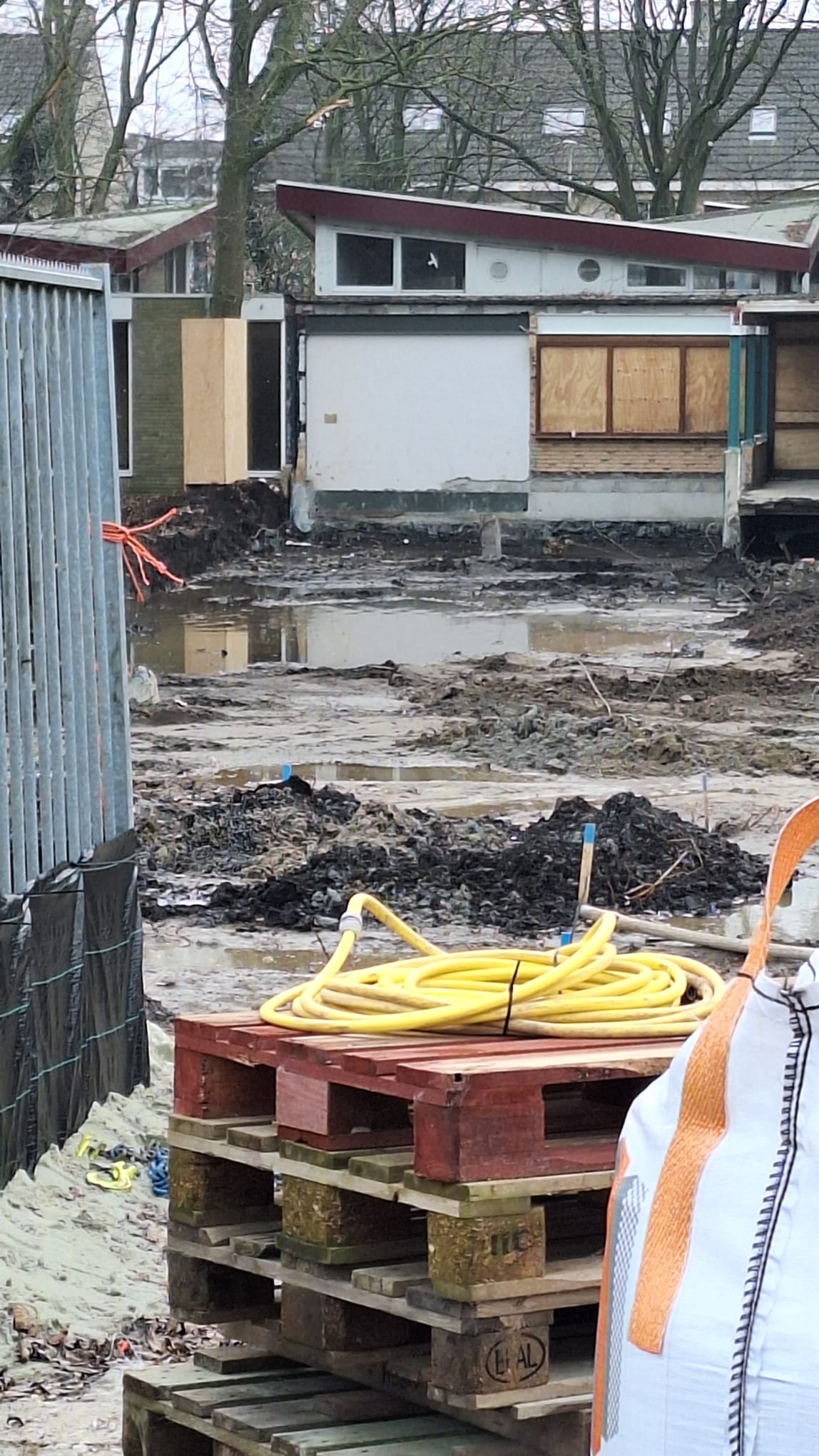 Bovenstaande foto's zijn van begin februari. De lokalen met de kenmerkende schuine daken blijven bestaan. Achter het grote witte kozijn is de patio (binnenplaats). Op de laatste foto het voetbaldoel van het schoolplein.